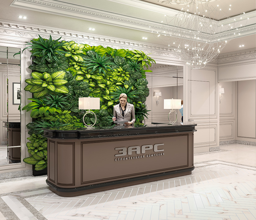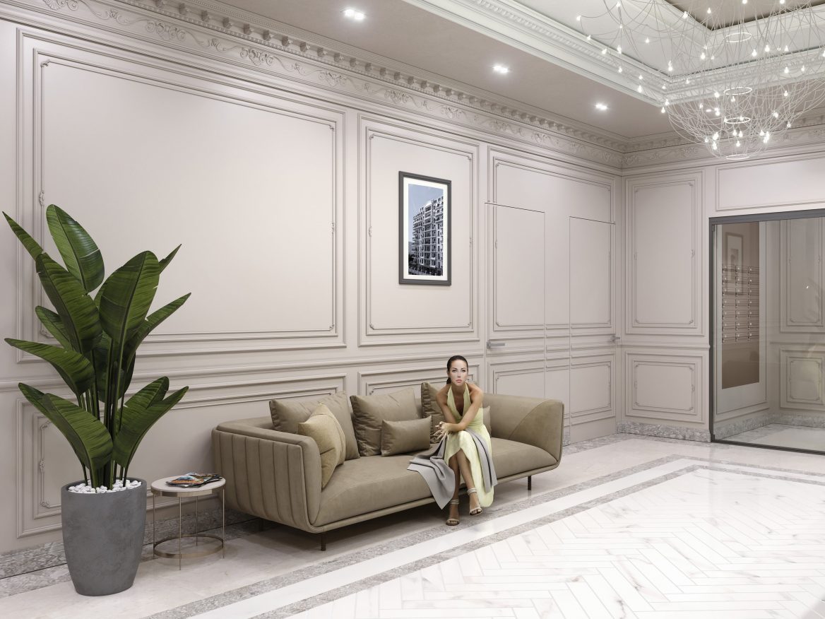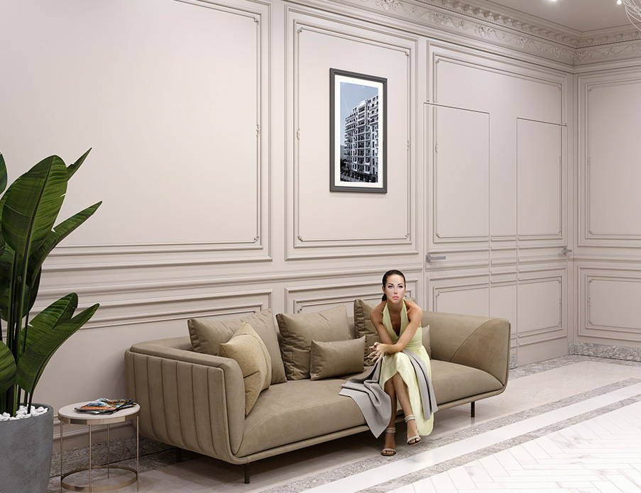 Интерьер холла и мест общего пользования оформлены премиальными материалами – мрамор, лепка, натуральное дерево